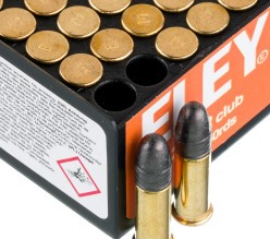 This ammo uses coated 40 grain lead round nose (LRN) bullet in a brass case. At a muzzle velocity of 1085 fps, ELEY Club is